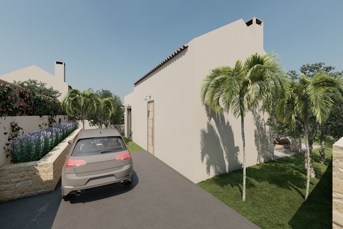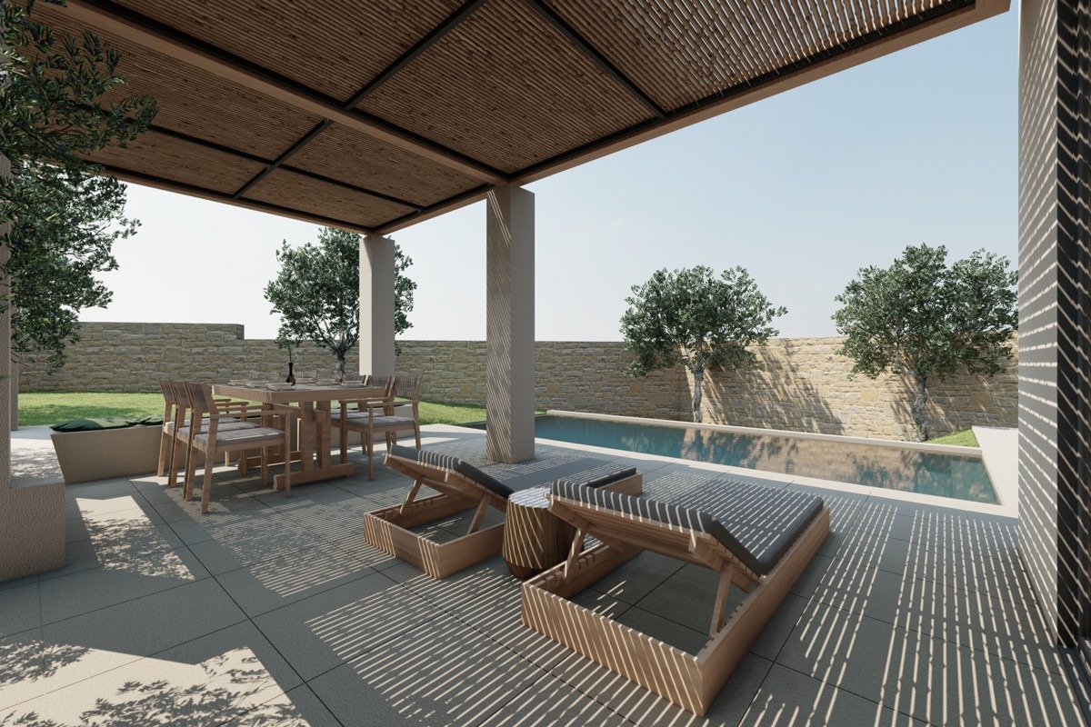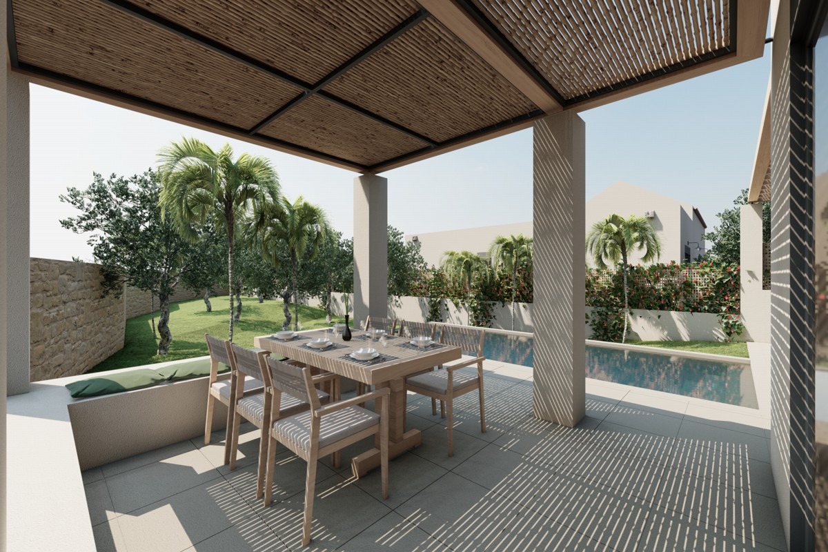 Η ανοιχτή κουζίνα με την τραπεζαρία και το καθιστικό ανοίγουν σε μεγάλη βεράντα με πέργκολα και ιδιωτική πισίνα, ενώ ένα υπνοδωμάτιο έχει απευθείας πρόσβαση στον εξωτερικό χώρο της βεράντας. Το σπίτι διαθέτει αποθηκευτικό χώρο, κλιματισμό και πλήρως διαμορφωμένο κήπο.