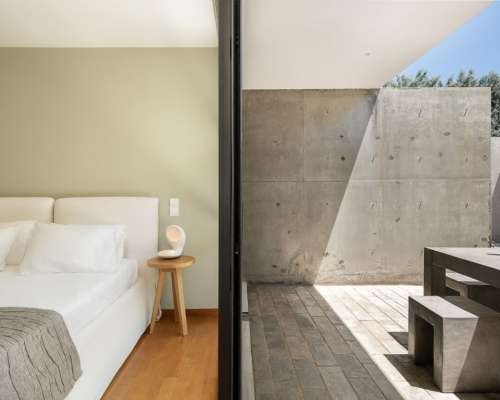 Περπατώντας κατά μήκος του διαδρόμου στο ίδιο επίπεδο θα βρείτε τρία κομψά υπνοδωμάτια, ένα μίνιμαλ σχεδιασμένο μπάνιο και ένα ευρύχωρο γραφείο. Συγκεκριμένα το πρώτο υπνοδωμάτιο διαθέτει δύο μονά κρεβάτια, κλιματισμό, τηλεόραση 27 ιντσών, ντουλάπα και άμεση πρόσβαση στον εξωτερικό χώρο. Το δεύτερο υπνοδωμάτιο διαθέτει κρεβάτι king size (1,60 x 2,00), κλιματισμό, ανεμιστήρα οροφής, τηλεόραση 27 ιντσών, ντουλάπα και άμεση πρόσβαση στον εξωτερικό χώρο. Το κύριο υπνοδωμάτιο διαθέτει κρεβάτι king size (1,60 x 2,00), ιδιωτικό μπάνιο με ντους, κλιματισμό, smart τηλεόραση 49 ιντσών, ντουλάπα, θυρίδα ασφαλείας και πρόσβαση σε ιδιωτικό αίθριο με λεμονιά. Επιπλέον υπάρχει ένα οικογενειακό μπάνιο με διπλούς νιπτήρες και καμπίνα ντους σε αυτό το επίπεδο. Το γραφείο διαθέτει επιφάνεια εργασίας και βιβλιοθήκη από ξύλο δρυός, καθώς και μια κομψή ανάκλιση που εγγυάται έναν ήσυχο και ήρεμο χώρο για μελέτη ή εργασία. Το γραφείο ανοίγει στο ίδιο ιδιωτικό αίθριο με το κύριο υπνοδωμάτιο. Τα έπιπλα εξωτερικού χώρου είναι μίνιμαλ σχεδιασμού: μαζί με το λευκό χαλίκι, αποτελούν τον χώρο του αίθριου όπου τα στοιχεία από σκυρόδεμα αγκαλιάζουν τη δομή.