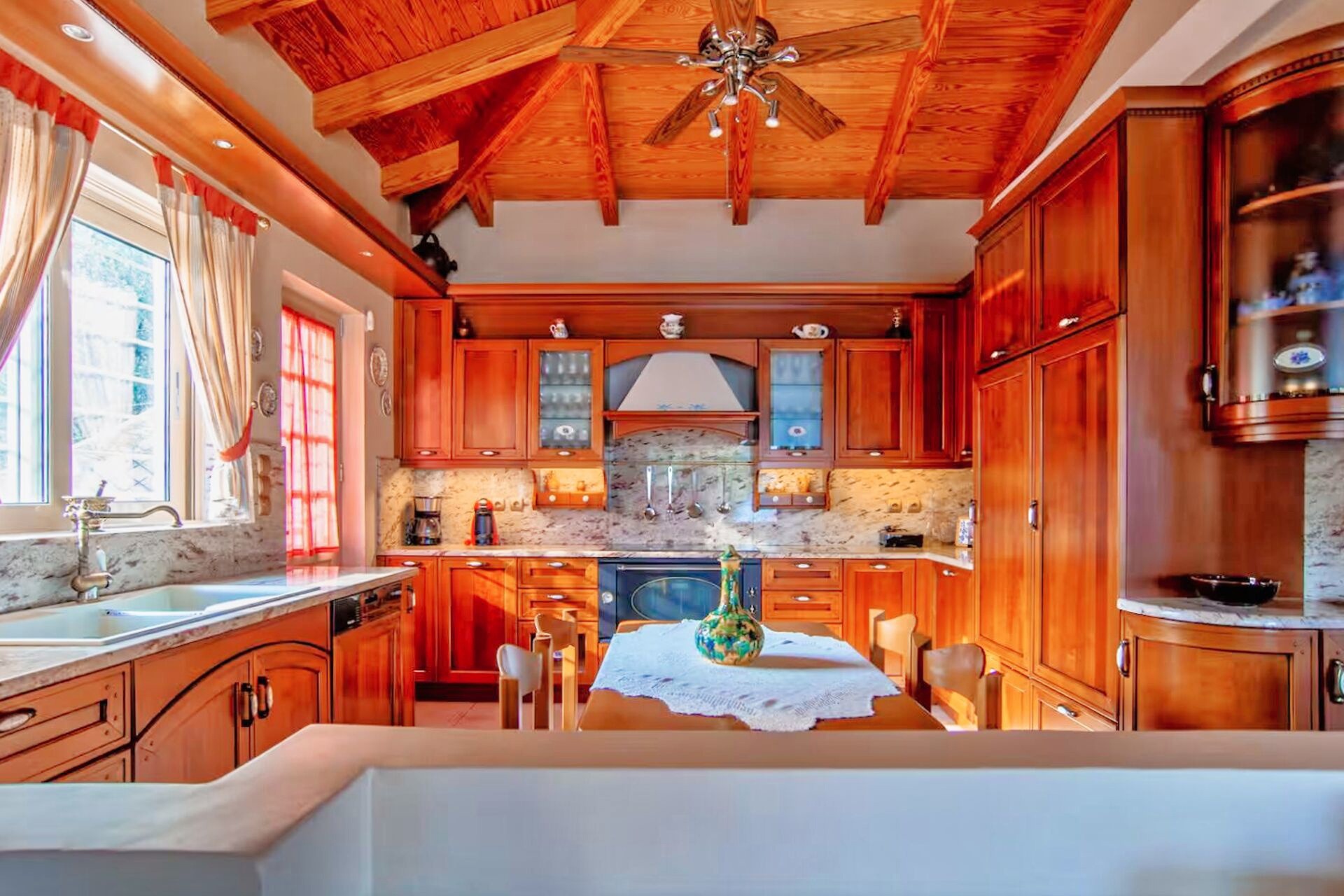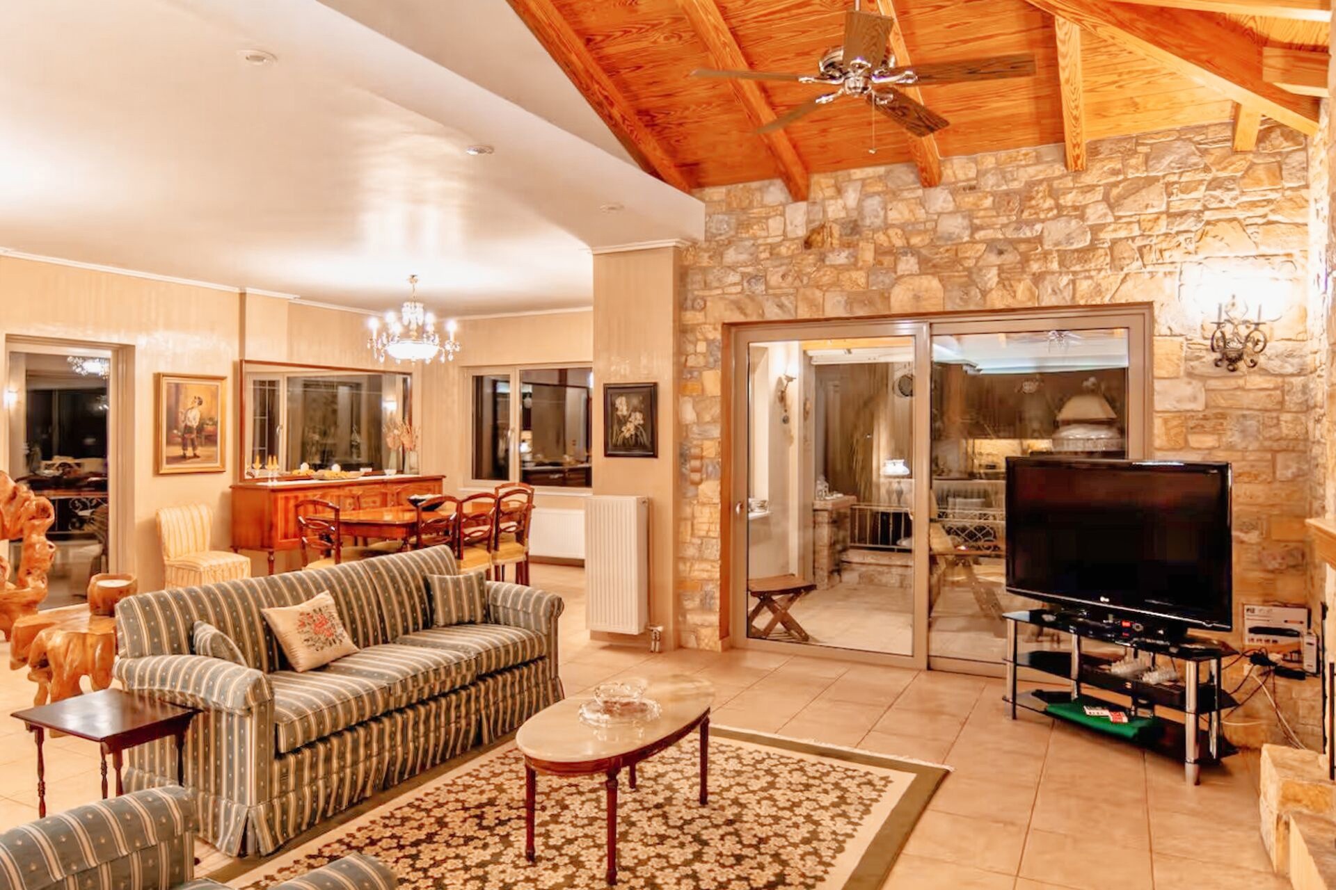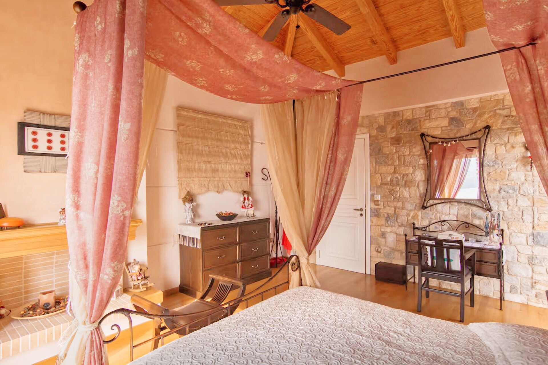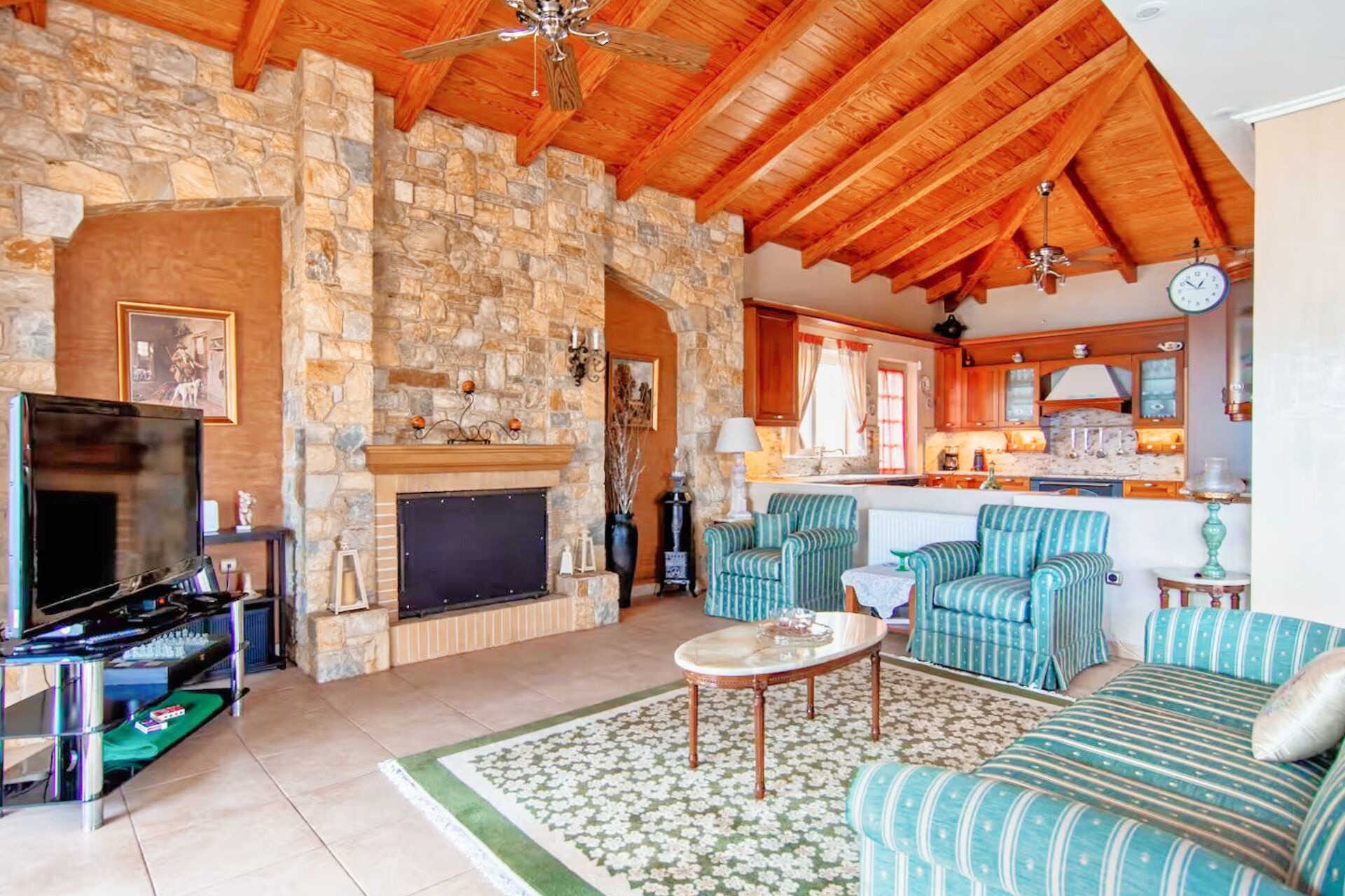 Οι εσωτερικοί χώροι διαθέτουν κλιματιστικά, ηλεκτρικούς ανεμιστήρες Hunter, δρύινη σκάλα, διπλά ενεργειακά τζάμια με σίτες και τζάκια τόσο στο καθιστικό όσο και στο υπνοδωμάτιο του τρίτου ορόφου. Η στέγη είναι κατασκευασμένη από ξύλο pitch pine με διπλή μόνωση, ενώ η εξωτερική επένδυση και οι μάντρες είναι εξ ολοκλήρου από πέτρα, αναδεικνύοντας την υψηλή ποιότητα κατασκευής.