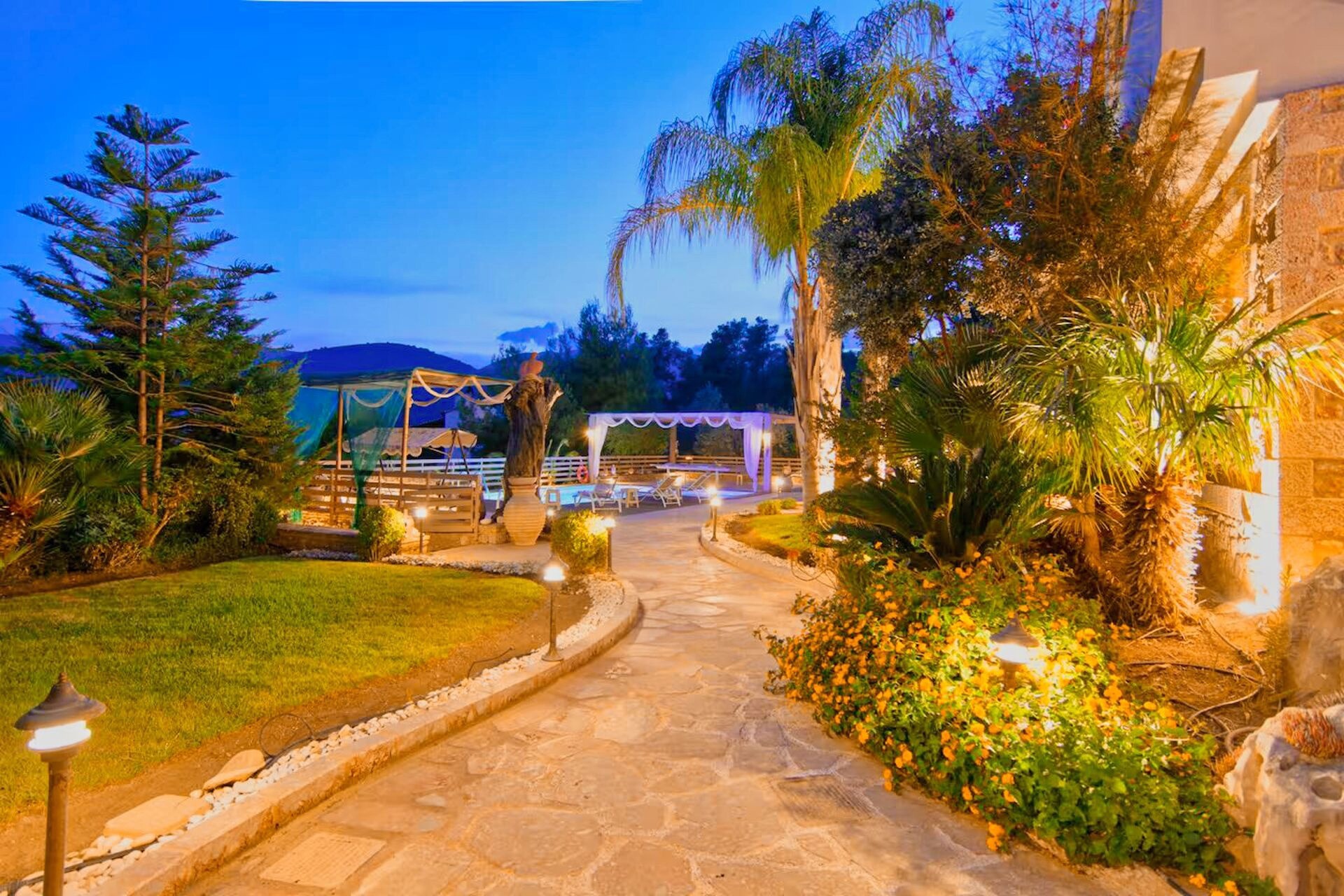 Ο περιβάλλον χώρος είναι πλήρως διαμορφωμένος με κήπο, πέτρινες πλακοστρώσεις, εξωτερική πισίνα 52 τ.μ., σκεπαστό BBQ, πέργκολα 50 τ.μ., χώρο στάθμευσης για σκάφος, βοηθητικό χώρο 23 τ.μ. για το λεβητοστάσιο και μηχανοστάσιο – αποθήκες συνολικής επιφάνειας 63,7 τ.μ.